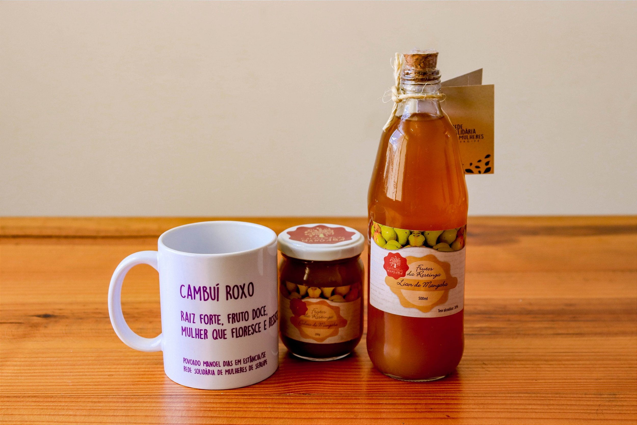 O Kit Contém uma Caneca de Porcelana no tema "Cambuí Roxo", uma Geleia de Mangaba de 200g e um Licor de Mangaba de 500ml.